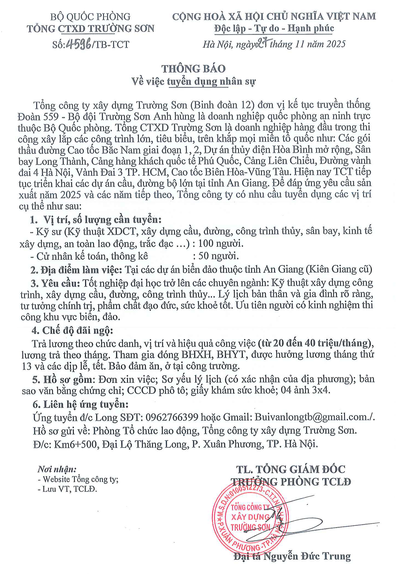 - Tổng công ty Xây dựng Trường Sơn tuyển dụng 100 kỹ sư xây dựng, xây dựng công trình thuỷ, xây dựng công trình giao thông