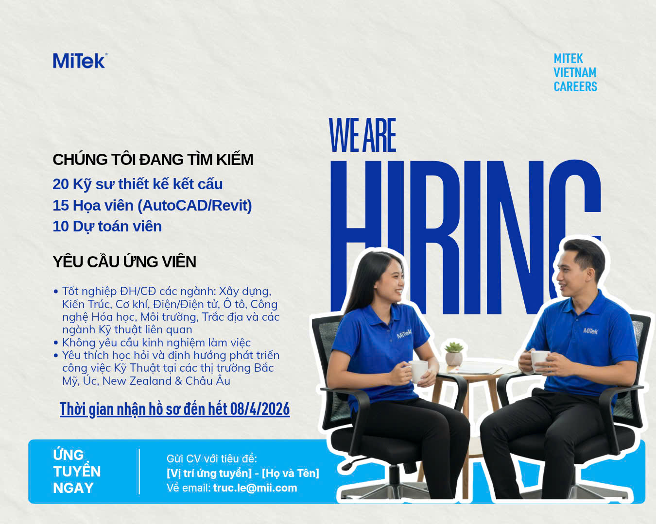 Trang chủ » Sinh viên - Học viên » Tuyển dụng » Mitek tuyển dụng 20 kỹ sư thiết kế kết cấu, 15 hoạ viên, 10 dự toán viên