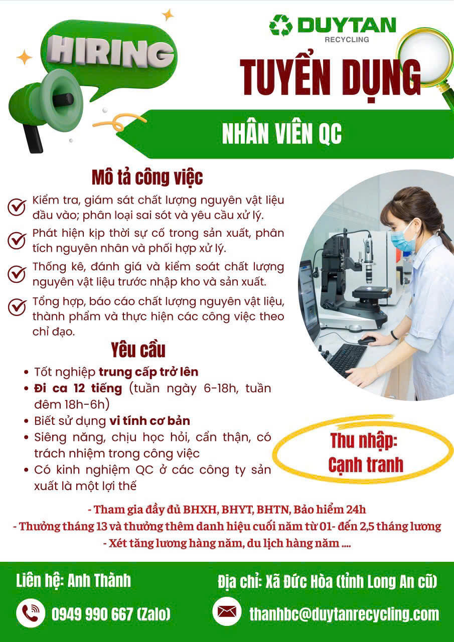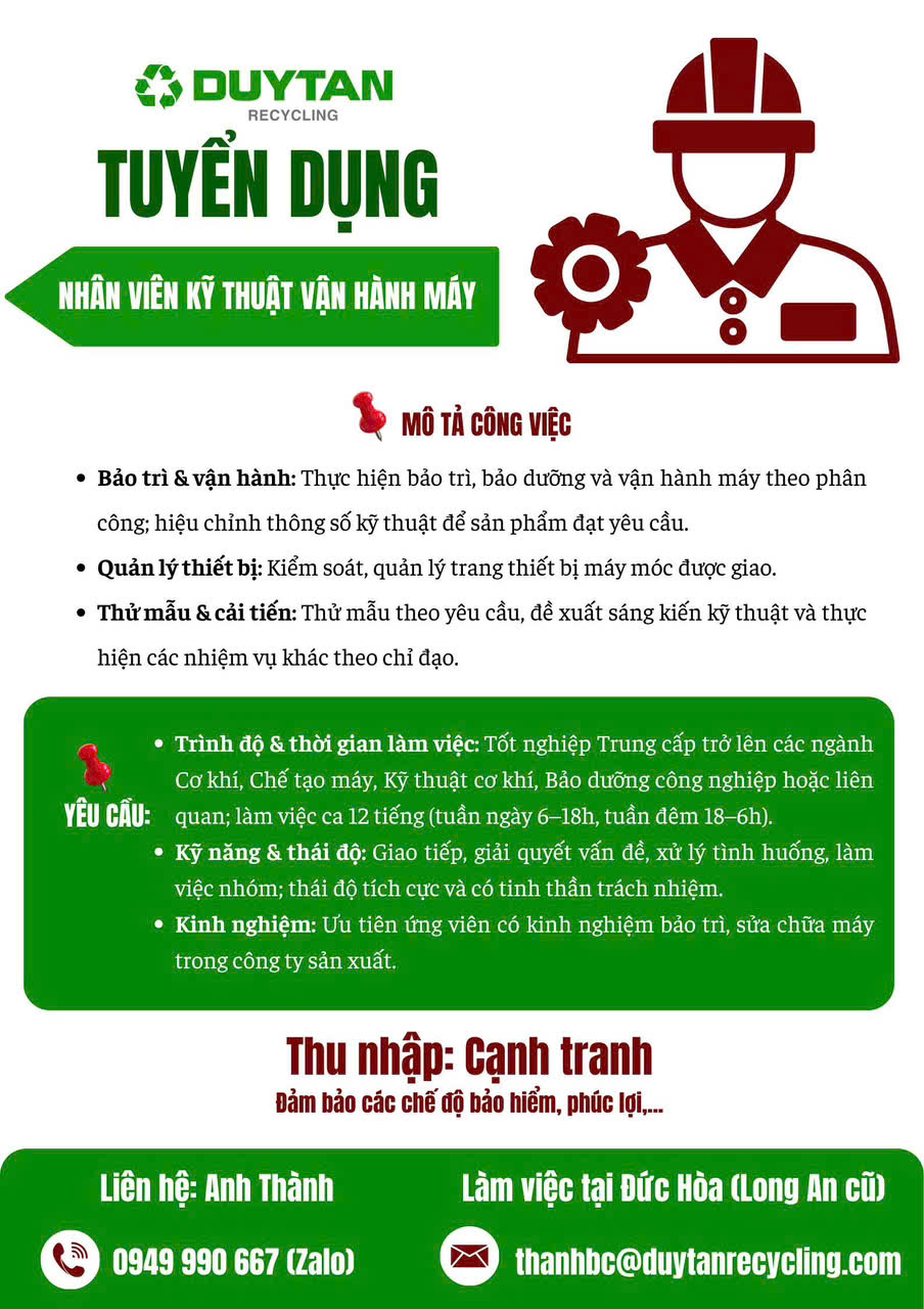 Trang chủ » Sinh viên - Học viên » Tuyển dụng » Nhà máy nhựa tái chế Duy Tân tuyển dụng Nhân viên QC, Nhân viên kỹ thuật vận hành máy