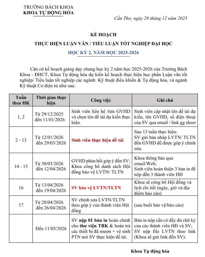 KẾ HOẠCH THỰC HIỆN LUẬN VĂN / TIỂU LUẬN TỐT NGHIỆP ĐẠI HỌC HỌC KỲ 2, NĂM HỌC 2025-2026